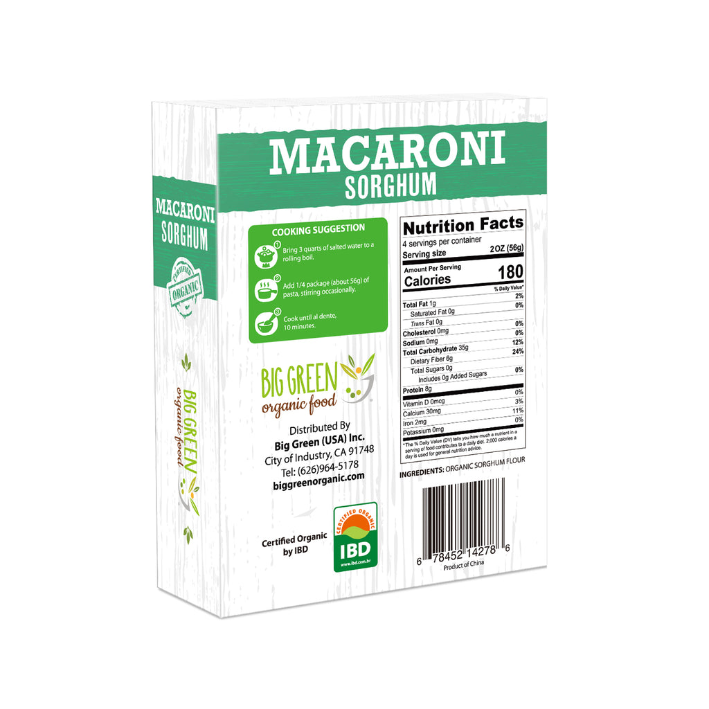 Big Green Organic sorghum macaroni is made with only organic red sorghum flour, nothing else!